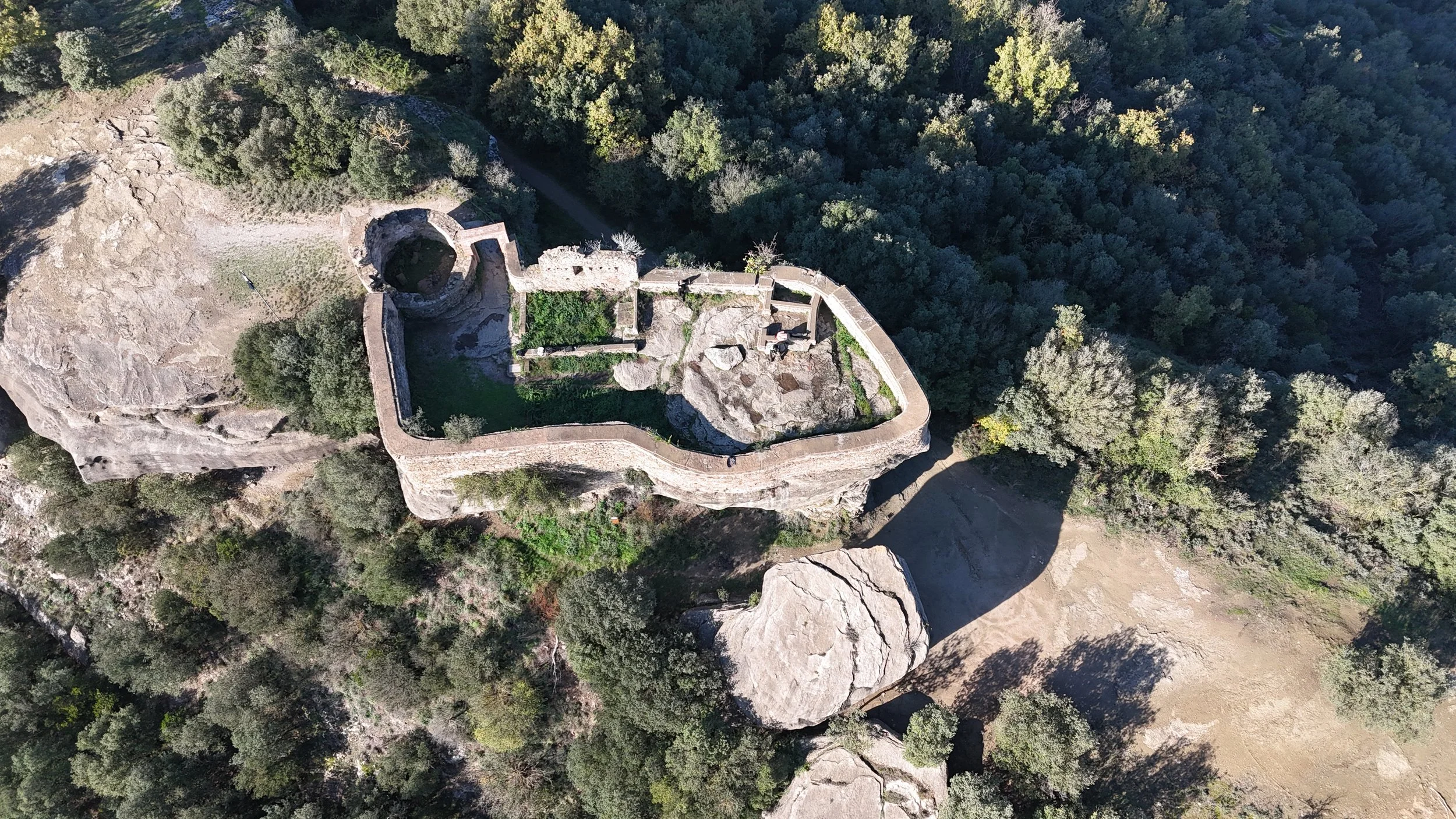 Video de viaje y visita al Castillo de Taradell en Osona, Cataluña con vistas aereas tomadas con drone y vistas a perspectiva del caminante